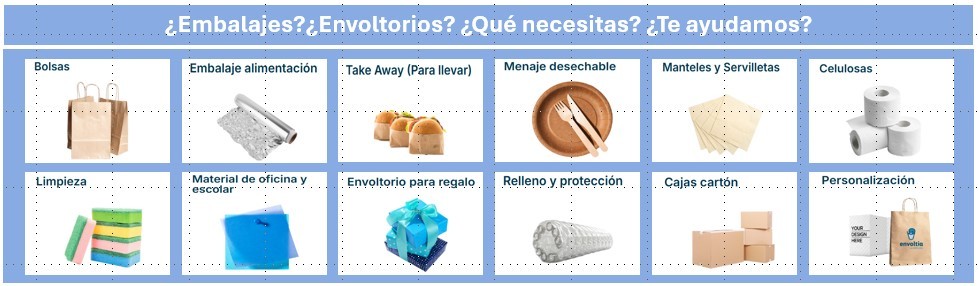Todo tipo de material para embalaje, desde cajas de cartón hasta plástico burbuja para protección, precintos, etc. Encuentra todo el menaje de plástico y cartón que necesitas. Especializados en bolsas, vasos y recipientes ecológicos y biodegradables. Disponemos de amplio stock de material de embalaje, de oficina, escolar, de limpieza, celulosa. Menaje específico para panaderías y pastelerías: Bandejas , blondas, cápsulas, cajas tartas y pastas impresas o anónimas. Visite nuestra tienda online o nuestra tienda física en Huesca.